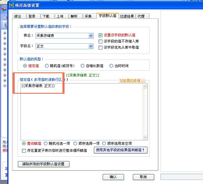 二、打开项目高级设置对话框,选择“字段默认值”标签,选择需要分页合并的[[表.字段]],并勾选“设置该字段的默认值”。确认是选择“恒定值”项。
