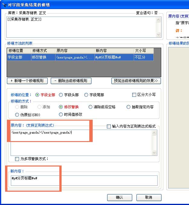 四、点击恒定值输入框右上的“对结果的修缮>>>”,打开结果的修缮对话框。新增一个修缮规则,在“原内容”输入框中填写“<nextpage_panda></nextpage_panda>”,在“新内容”输入框中填写“#p#分页标题#e#”即可。如下图:
